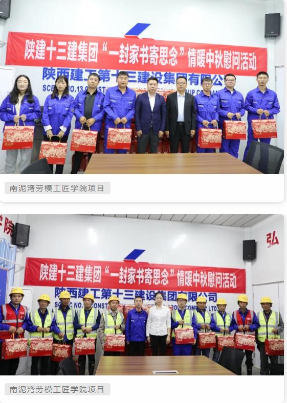 在中秋佳節(jié)來臨之際,9月16日至17日,陜建十三建集團(tuán)黨委、工會(huì)分別赴金鴻·行知坊項(xiàng)目、伴山樾谷·芳菲里項(xiàng)目、南泥灣勞模工匠學(xué)院項(xiàng)目施工一線慰問項(xiàng)目管理人員和廣大農(nóng)民工朋友,并為他們送去了月餅及節(jié)日的祝福。
