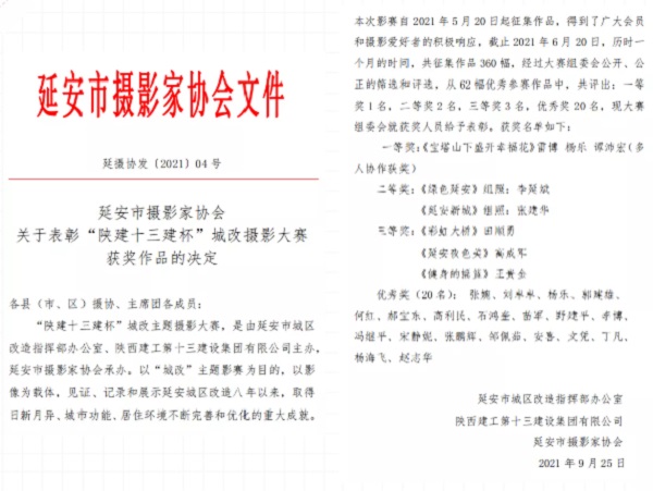 9月29日,由延安市城區(qū)改造指揮部辦公室聯(lián)合陜西建工第十三建設(shè)集團(tuán)有限公司主辦、延安市攝影家協(xié)會(huì)承辦的“陜建十三建杯”城改攝影比賽頒獎(jiǎng)儀式暨獲獎(jiǎng)作品展在延安市小東門廣場(chǎng)圣地影像畫(huà)廊圓滿舉行。