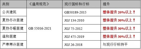《通用規(guī)范》提高了居住建筑、公共建筑的熱工性能限值要求,與大部分地區(qū)現(xiàn)行節(jié)能標準不同,平均設(shè)計能耗水平在現(xiàn)行節(jié)能設(shè)計國家標準和行業(yè)標準的基礎(chǔ)上分別降低 30%和 20%。