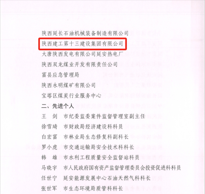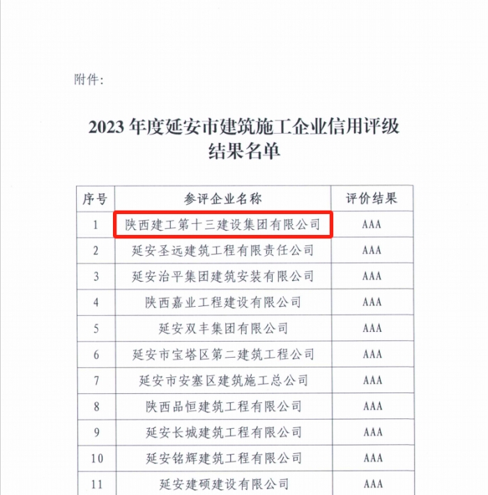 同時,延安市建協(xié)公布了2023年度延安市建筑施工企業(yè)信用評級結果:陜建十三建集團被評為AAA級企業(yè)。
