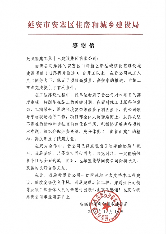 近日,集團第一工程公司施工的安塞區(qū)白坪新區(qū)新型城鎮(zhèn)化基礎設施建設項目收到來自安塞區(qū)住建局的感謝信,對集團項目部管理團隊在施工過程中的迎難而上、攻堅克難,高質量、高效率推進項目建設予以高度贊揚。
