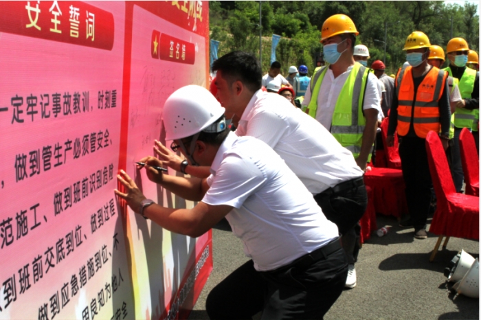 全體人員進行安全承諾宣誓并在背景墻簽字承諾。