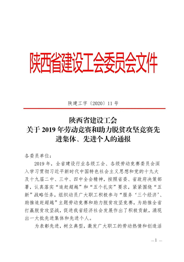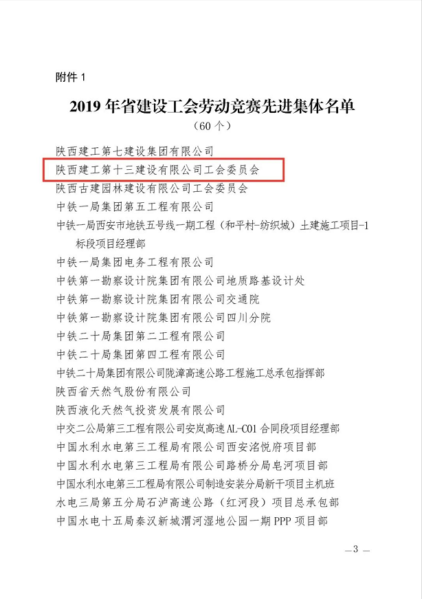 日前,陜西省建設工會通報表彰2019年勞動競賽和助力脫貧攻堅競賽先進集體、先進個人。陜建十三建公司工會委員會榮獲“2019年陜西省建設系統(tǒng)勞動競賽先進集體”稱號。
