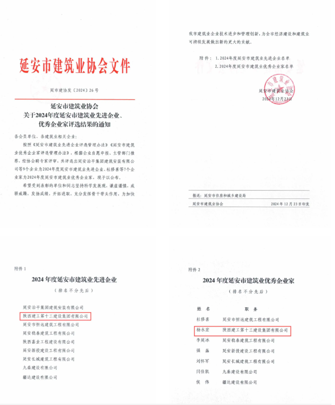 2024年,在延安市委、市政府和陜建集團黨委的堅強領(lǐng)導(dǎo)下,十三建集團貫通落實黨的二十屆三中全會精神和習(xí)近平總書記歷次來陜考察重要講話重要指示,踐行“11359”工作方針,突出經(jīng)營提質(zhì)、改革蓄能、管理強基、品牌增效、黨建聚力“五個抓手”,沉著應(yīng)變、綜合施策,在復(fù)雜的環(huán)境和不利的行業(yè)形勢中穩(wěn)步前行,先后榮獲延安市建筑業(yè)穩(wěn)增長優(yōu)秀企業(yè)、全國工程建設(shè)AAA級信用企業(yè)等榮譽。